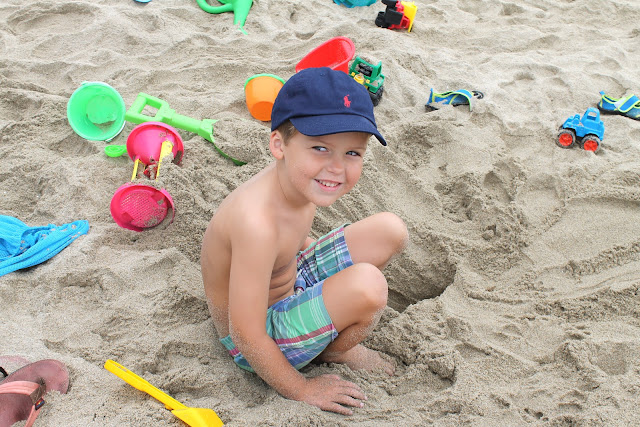 Isaac wasn't interested in playing in the water, but he had a great time up on the sand. He loved having Aunt Carly to play with. They found a starfish, and dug tunnels and giant holes in the sand.